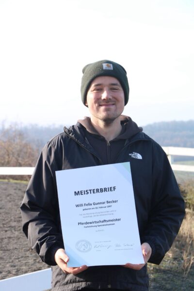 Willi Becker aus der SAGA-Reitschule Grenzlandhof hat mit Erfolg seine Meisterprüfung abgelegt. Er ist jetzt Pferdewirtschaftsmeister Spezialreitweisen. Neben seiner Ausbildung als staatlich geprüfter Hufschmied, als Trainer C (bald B) und als Jungpferdebereiter hat Willi seinen Qualifikationen nun eine weitere hinzugefügt. Die anspruchsvolle Ausbildung dauerte zwei Jahre und umfasste eine Vielzahl an Fächern. Herzlichen Glückwunsch Willi.
